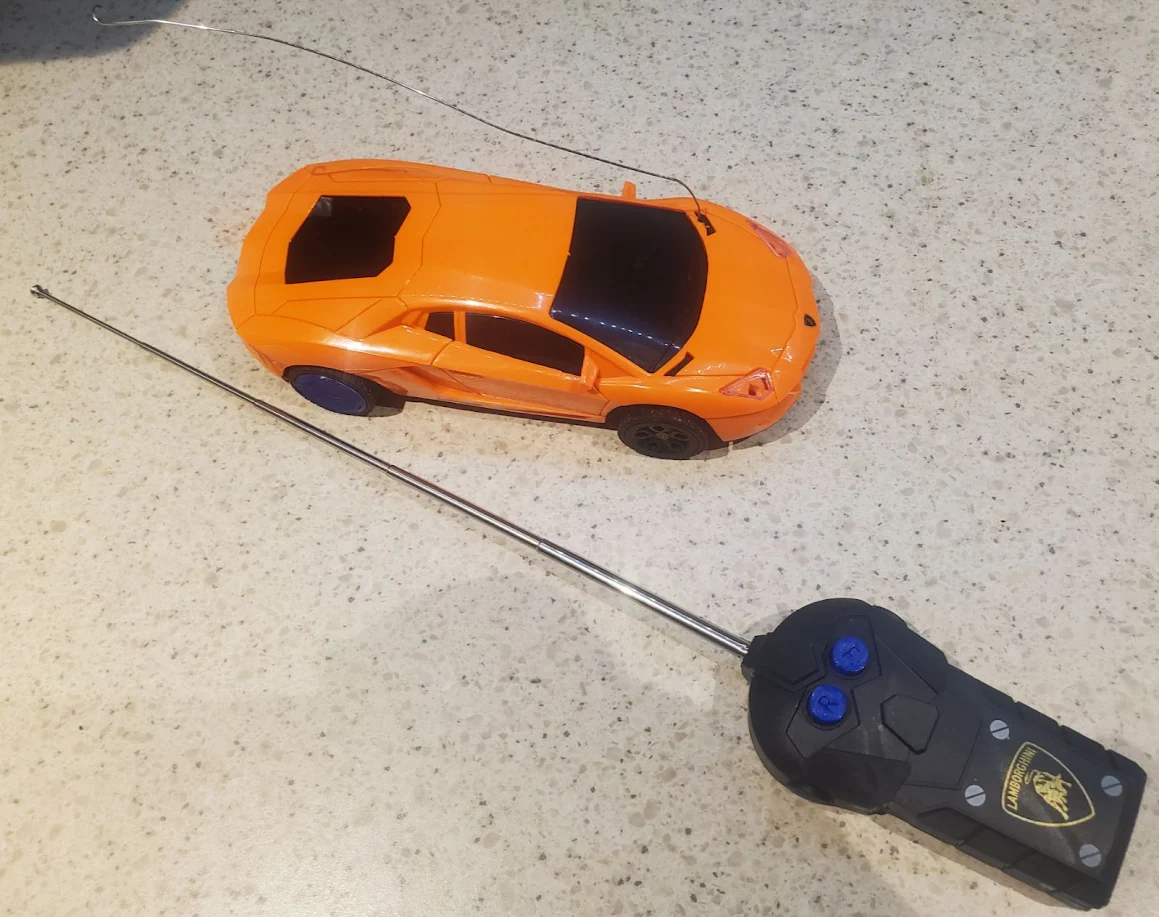 Latest upgrade to this dollar store toy. The original car didn't have any kind of antenna on the car, and so the remote range was basically within arm distance.